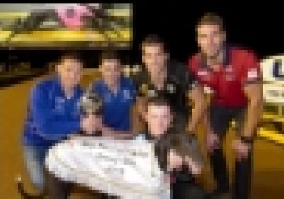 Dyna Nalin and trainer Paul Stuart with AFL stars (left to right) Brent Harvey, Nathan Grima, Alex Rance and Mark Jamar. Photos: Paul Munt. CRAFTY WA GREYHOUND TRUMPS AUSTRALIA’S BEST A combination of determination and intelligence secured Western Australian greyhound Dyna Nalin victory in last night