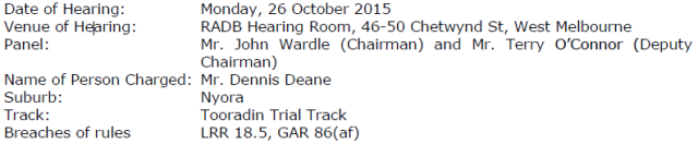 (4) Dennis Dean did, on 18 November 2014 at Tooradin, on an occasion other those occasions referred to in Charges 1 & 2 and Charges 5 & 6 and Charges 7 & 8 herein, use an animal (namely, a live rabbit) for a purpose connected with greyhound racing in a manner which was improper, namely, the exciting of two black greyhounds (both with white chests and necks, being handled by him), whilst Stuart Mills had the live rabbit on a leash at the Tooradin Trial Track located at 175 Harewood-Mains Road, Tooradin.