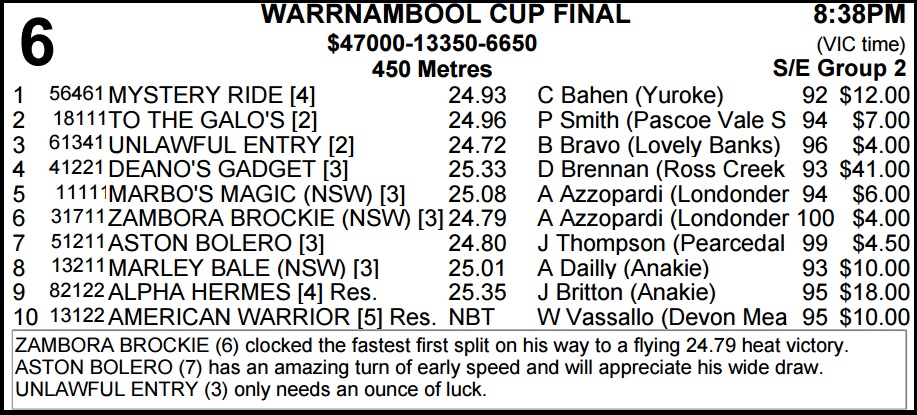 I’m going with Zambora Brockie (Pictured with trainer Anthony Azzopardi). He was awesome winning his heat in the brilliant time of 24.78 seconds (Replay). He is armed with devastating early speed but he can be hit or miss at the start. In the Cup I expect him to ping out of the boxes and lead. If he does this I think he will be too good.