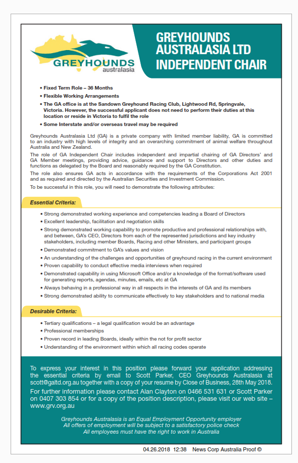 Greyhounds Australasia’s (GA) vision is to foster a cohesive and vibrant national greyhound racing industry that is a valued part of the community, and that puts animal welfare and integrity at the centre of everything it does.