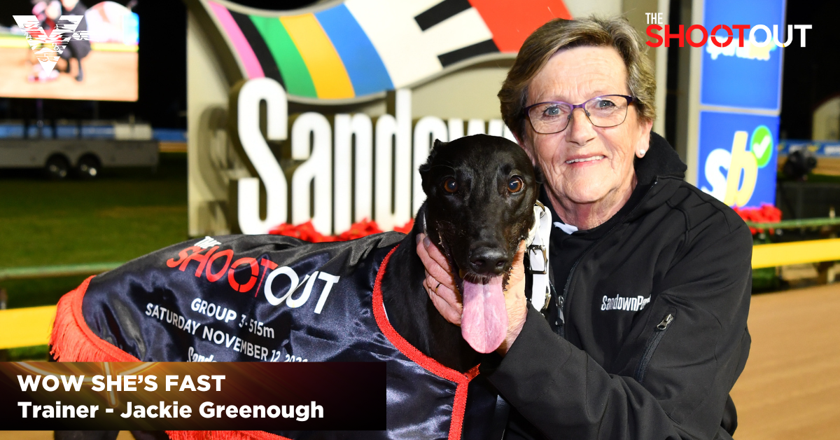 Trained at Pearcedale by Jackie Greenough, Wow She’s Fast proved she’s the ‘fastest gun’ in Australian greyhound racing with a bullet-like, come-from-behind win in the $50,000 to-the-winner four-dog face-off.