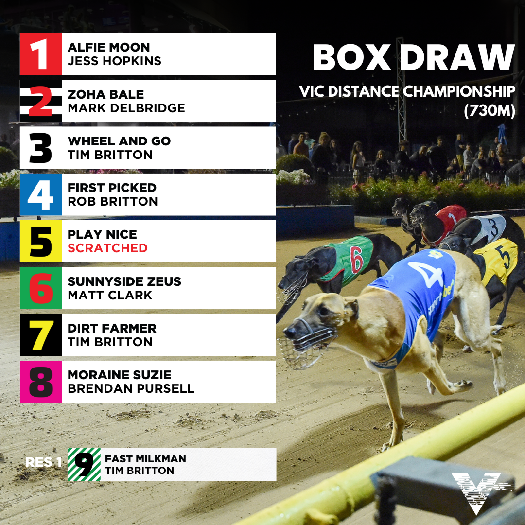 It may well be a big night for Delbridge who also has Yachi Bale (Box 2) – a litter brother of Zoha Bale – and Landyn Bale (Box 8) in the $17,835 Victorian National Sprint final (525m) – Race 8, 8.43pm.