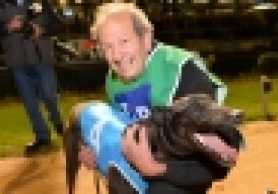 Tony Flores embraces Amity Flame after the greyhound recorded the fastest Bold Trease heat win in 42.17sec. Photo: Clint Anderson. LITTER QUINELLA A PIPEDREAM FOR VETERAN TRAINER FLORES Small time trainer Tony Flores hasn